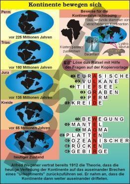 Transparente: Kontinente bewegen sich, 1. Theorie der Plattentektonik, Bildung und Zerstörung von Erdkruste und ihre Ursachen anhand eines anschaulichen Blockbildes, 2. Theorie der Kontinentaldrift von Alfred Wegener, Veränderung der Kontinente im Laufe der Erdgeschichte, - Beweise für die Kontinentaldrift: passende Küstenlinien, Fossilienfunde, - Rätsel, - zusätzliche Kopiervorlage: Die Erde mit wichtigen Platten als Puzzle (siehe Abbildung), 4 Folien, 4 Kopiervorlagen, Lehrerbegleittext-- verwandte Stichworte: Folienmappe, Folienordner, Overheadfolien, Folienbuch, Überlegfolien, Foliensatz
