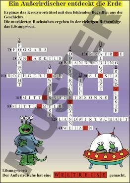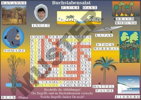 Transparente: Rätselspiele: Lebensräume der Erde, 1. Für welche Vegetationszonen sind die Klimadiagramme typisch? Hier geht es darum, Klimadiagramme verschiedenen Vegetationszonen zuzuordnen, - anschließend soll die Zone auf einer Karte lokalisiert werden. Aus den richtigen Lösungen ergibt sich ein Lösungswort (Abbildung rechts), 2. Ein Außerirdischer entdeckt die Erde, Mit der Geschichte eines Außerirdischen sollen Begriffe rund um verschiedene Lebensräume der Erde wiederholt werden. Die gefundenen Begriffe werden in das Kreuzworträtsel eingetragen und am Ende ergibt sich ein Lösungswort (siehe Abbildung), 3. Buchstabensalat: Begriffe aus den verschiedenen Lebensräumen sollen wiederholt werden. Sie wurden in einem Buchstabensalat versteckt (siehe Abbildung), 6 Folien, 3 Kopiervorlagen, Lehrerbegleittext-- verwandte Stichworte: Folienmappe, Folienordner, Overheadfolien, Folienbuch, Überlegfolien, Foliensatz