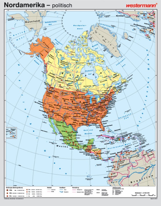 Wandkarte Nordamerika, Vorderseite physisch / Rückseite politisch,