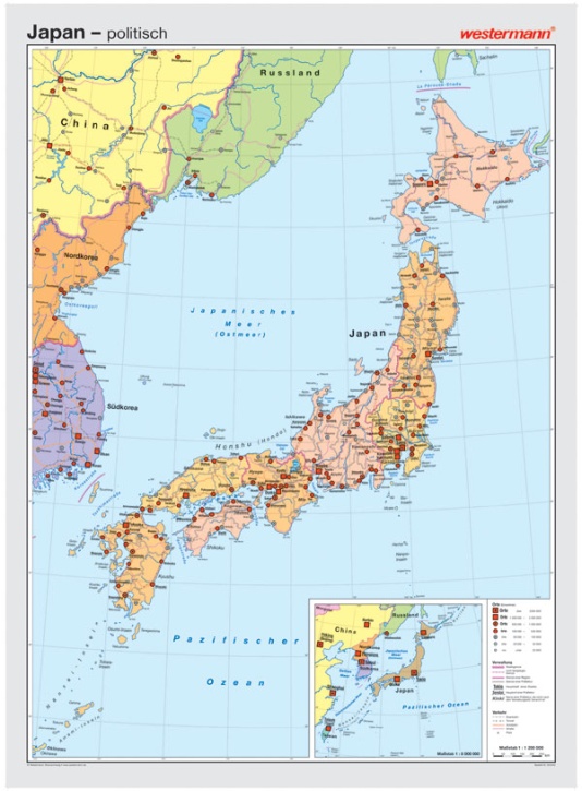 Wandkarte Japan, Vorderseite physisch / Rückseite politisch