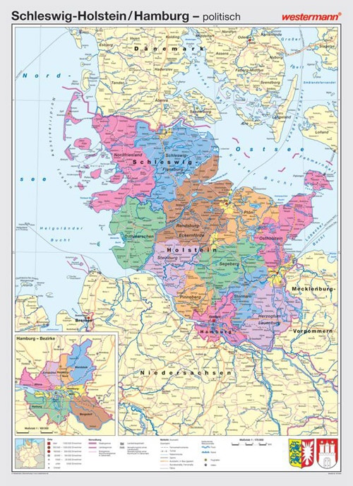 Wandkarte Schleswig-Holstein und Hamburg, Vorderseite physisch / Rückseite politisch,