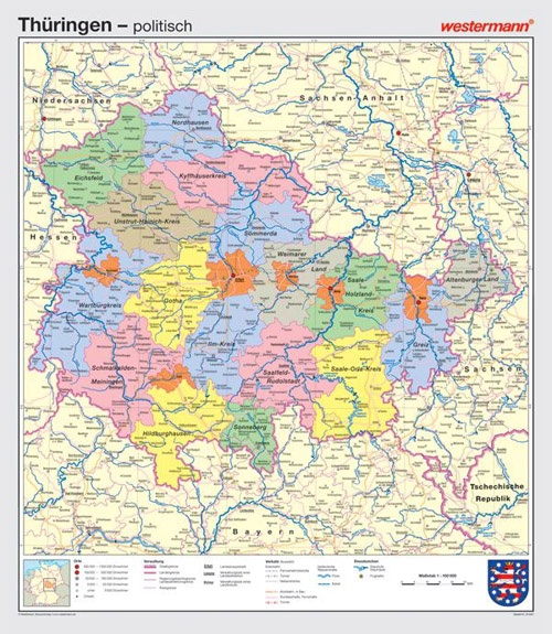 Wandkarte Thüringen, Vorderseite physisch / Rückseite politisch,