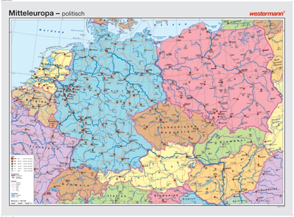 Wandkarte Mitteleuropa, Vorderseite physisch / Rückseite politisch,