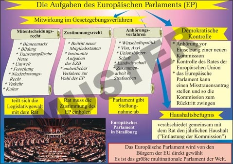 Transparente: Das Europäische Parlament, 1. Organisation und Arbeitsweise (siehe Abbildung), 2. Aufgaben: Mitwirkung im Gesetzgebungsverfahren, Demokratische Kontrolle, Haushaltsbefugnis (siehe Abbildung), 3. Die Mitglieder im EP, Aktuelle Zusammensetzung (siehe Abbildung), 5 Folien, 3 Kopiervorlagen, Lehrerbegleittext -- verwandteStichworte: Folienmappe, Folienordner, Overheadfolien, Folienbuch, Überlegfolien, Foliensatz