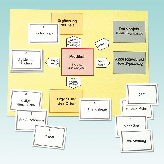 Jede Dose enthält Satzzerlegungskarten und Satzgliedkarten (Dose 1: 12, Dose 2: 32, Dose 3: 45),