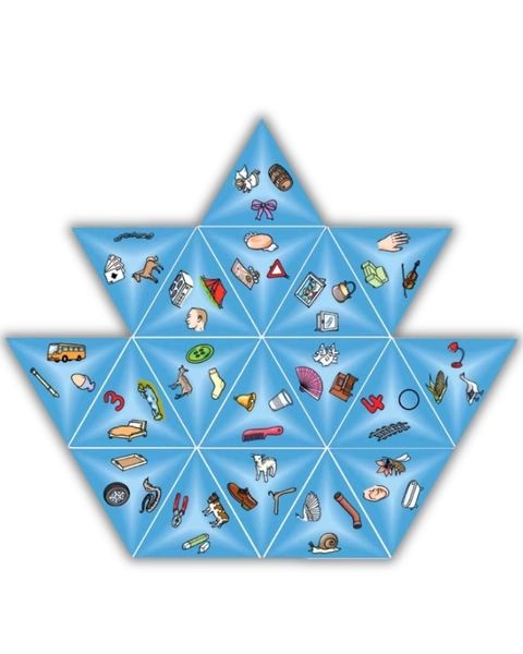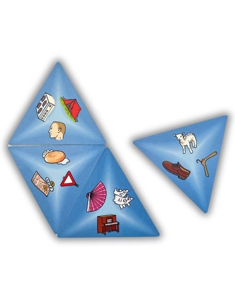 Wenn die dreieckigen Spielkarten so zusammenfügt werden, dass die beiden Wörter der aneinander