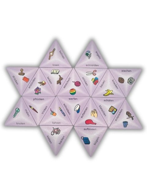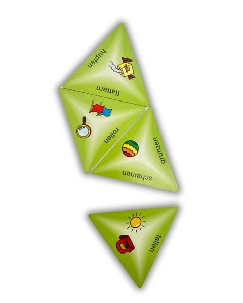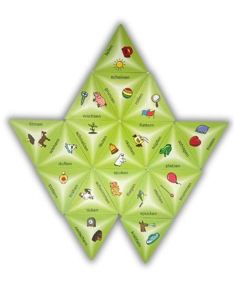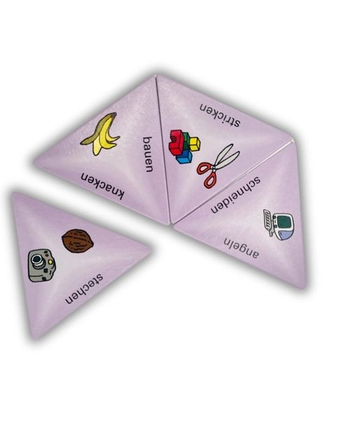 Wenn die dreieckigen Spielkarten so zusammenfügt werden, dass die beiden Wörter der aneinander liegenden Seiten
