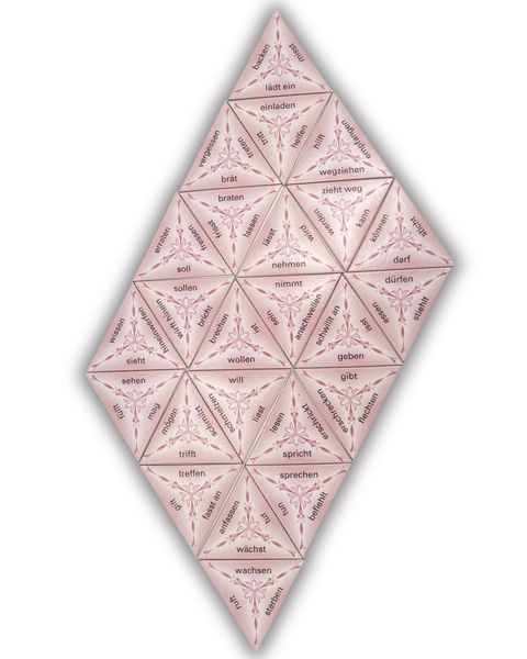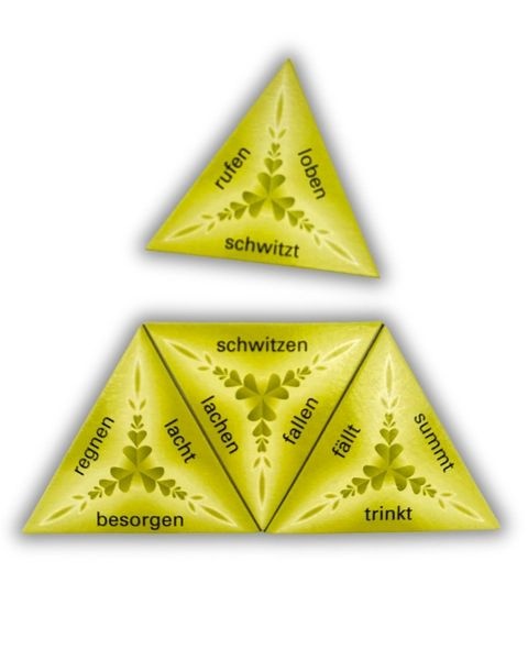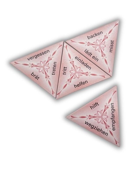 Wenn die dreieckigen Spielkarten so zusammenfügt werden, dass die beiden Wörter der aneinander liegenden Seiten zusammenpassen,