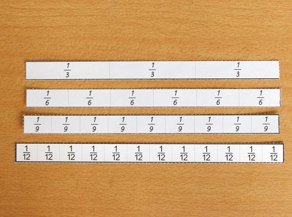 Material für 15 Schüler: 15 Streifensets mit Messstreifen und Bruchstreifen von 1 bis zu 1/20, Fotoanleitung mit Anregungen