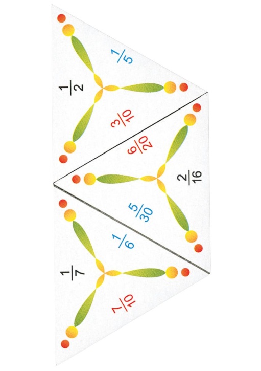 Die Dreiecke aus stabilem Karton werden so aneinander gelegt, dass Rechnung und Ergebnis übereinstimmen.