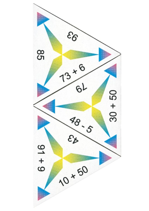 Die Dreiecke aus stabilem Karton werden so aneinander gelegt, dass Rechnung und Ergebnis übereinstimmen.