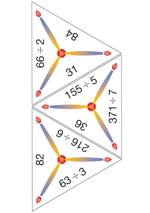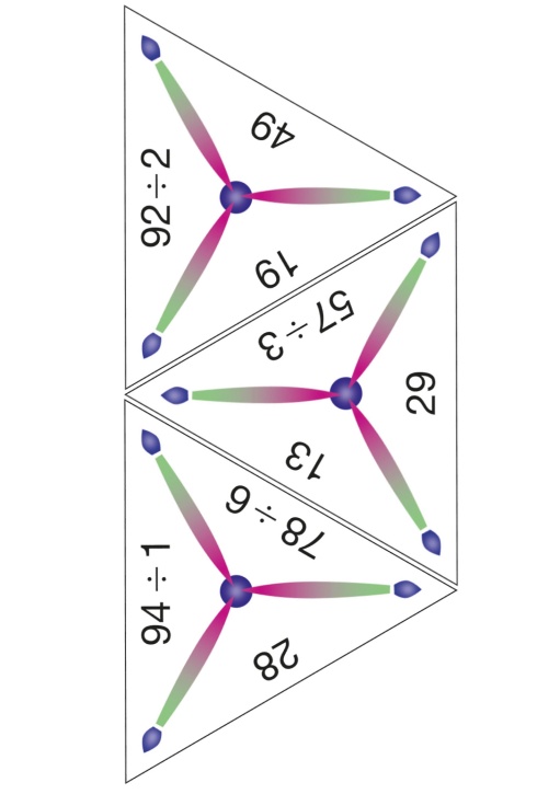 Die Dreiecke aus stabilem Karton werden so aneinander gelegt, dass Rechnung und Ergebnis übereinstimmen.