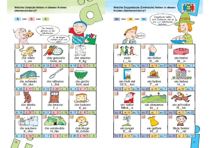 Lük-Heft Rechtschreibwerkstatt 2. Kl. Beschreibung: Übungen auf Basis des Grundwortschatzes: Nomen und Verben - Ordnen nach dem ABC, Selbstlaute, Mitlaute, Endungen, Silben... Das Lernen an Stationen gehört mit seinen individuellen Lernangeboten zu den bedeutendsten Unterrichtsformen im Rahmen der freien Arbeit. Dabei ist das Lernen und Arbeiten an der LÜK-Station besonders motivierend, weil es eigenverantwortlich und mit Selbstkontrolle erfolgen kann. Inhalt - 2 Ordnen nach dem Abc – die Klassenliste - 3 Nomen nach dem Abc – Menschen, Tiere und Dinge - 4 Welches der beiden Nomen kommt nach dem Abc zuerst? - 5 Welches der drei Wörter kommt nach dem Abc zuerst? - 6 Mit welchem Selbstlaut fängt das Nomen (Namenwort) an? - 7 Welcher Selbstlaut fehlt in dem Nomen (Namenwort)? - 8 Mit welchem Mitlaut fängt das Nomen (Namenwort) an? - 9 Welcher Mitlaut fehlt in dem Nomen (Namenwort)? - 10 Welche Endungen haben diese Nomen (Namenwörter) gemeinsam? – e oder er - 11 Welche Endungen haben diese Nomen (Namenwörter) gemeinsam? – el, en oder er - 12 Wörterzauber – ausgetauschte Mitlaute bei Nomen (Namenwörtern) - 13 Wörterzauber – ausgetauschte Selbstlaute bei Nomen (Namenwörtern) - 14 Wie fangen diese Wörter an? – Verben (Zeitwörter) und Adjektive (Eigenschaftswörter) - 15 Ist das ein Nomen (Namenwort)? - 16 Welche Umlaute fehlen in diesen Nomen (Namenwörtern)? - 17 Welche Doppellaute (Zwielaute) fehlen in diesen Nomen (Namenwörtern)? - 18 Wörter mit K/k am Anfang – groß oder klein? - 19 Wörter mit G/g am Anfang – groß oder klein? - 20 Wörter mit verschiedenen Mitlauten am Anfang - 21 Wörter mit St/Sp und st/sp am Anfang - 22 Wie viele Silben hat das Nomen (Namenwort)? - 23 Wie heißt die abgetrennte Silbe? - 24 Sind die Selbstlaute lang oder kurz? - 25 Wörter mit au und mit ei - 26 Wörter mit doppelten Mitlauten – Welches Wort reimt sich nicht? - 27 Suchrätsel – Verben (Zeitwörter) mit doppelten Mitlauten - 28 Umlaute bei der Mehrzahlform - 29 Umlaute bei der Verkleinerungsform