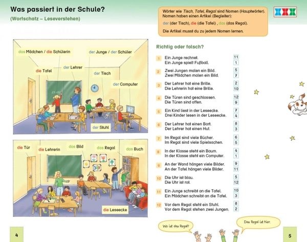 Auf spielerische Art bearbeiten die Kinder Aufgaben zu den Formen des Wortes sein und haben, lernen den Imperativ, Dativ, Akkusativ und Nominativ kennen und beschäftigen sich mit Uhrzeiten und Jahreszeiten.