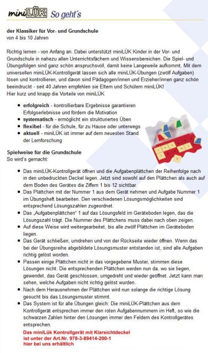 mini-Lük Heft Erste Rechenschritte, geeignet für: Baden-Württemberg, Bayern, Berlin, Brandenburg, Bremen, Hamburg, Hessen, Mecklenburg-Vorpommern, Niedersachsen, Nordrhein-Westfalen, Rheinland-Pfalz, Saarland, Sachsen, Sachsen-Anhalt, Schleswig-Holstein, Schweiz, Thüringen, Österreich, Schulform: Grundschule, Kindergarten/Vorschule, Schuljahr: 0, Beschreibung: Erste Mengen und Zahlen für Kinder ab 5 Jahren, Mit regelmäßig angeordneten Mengen lernen Kinder Anzahlen bis 4 mit einem Blick zu erfassen. So können auch Anzahlen bis 10 additiv als Teilmengen erfasst werden und müssen nicht einzeln gezählt werden. Die Zuordnung von strukturierten Mengen und Zahlzeichen (=Ziffern) und deren Umkehrung von sechs Aufgaben fördert das flexible Denken und bereitet die Kinder auf den Rechenanfangsunterricht vor. Zur Bearbeitung dieses Übungsheftes benötigen Sie das universelle miniLÜK-Kontrollgerät mit Klarsichtteil 978-3-89414-200-1
