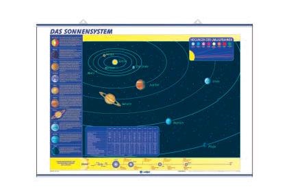 Astronomiekarte, beidseitig bedruckt, eine Seite - Bewegungen der Erde -, die andere Seite - das Sonnensystem -, hochglanzkaschiert und beschreibbar, mit zwei Plastikleisten und 2 verstellbaren Aufhängern, Format 115x90 cm, Verpackt in Einzelschutzröhre