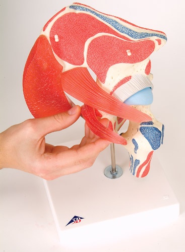 Aus didaktischen Gründen sind die Ursprungs- und Ansatzflächen der Muskeln erhöht und farbig (Ursprung = rot; Ansatz = blau) dargestellt.