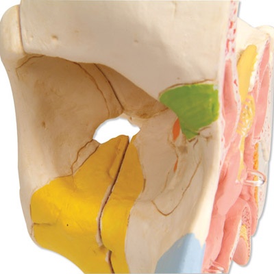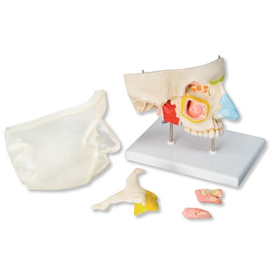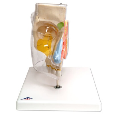 Das Modell veranschaulicht in 1,5facher Vergrößerung den Aufbau der Nase mit den Nasennebenhöhlen innerhalb einer rechten oberen Gesichtshälfte.