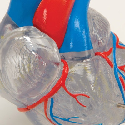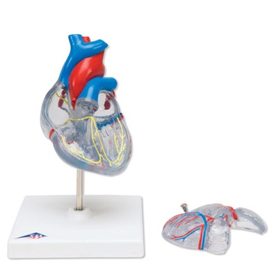 Klassik-Herz mit Reizleitungssystem, 2 teilig, Mit diesem transparenten Modell können Sie die Anatomie des Herzens mit Kammern, Vorhöfen, Venen und Aorta detailliert studieren und demonstrieren. Die vordere Herzwand ist zur Ansicht der Kammern abnehmbar. Weiterhin zeigt es das Reizleitungssystem in Farbe. Auf Sockel. Größe: 19 x 12 x 12 cm