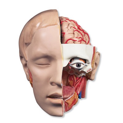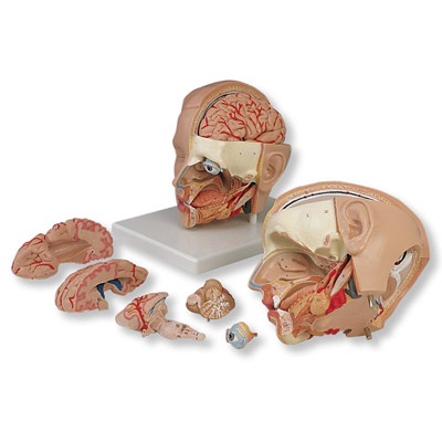 Der lebensgroße, 6-teilige Kopf beinhaltet eine herausnehmbare 4-teilige Gehirnhäfte mit Arterien.