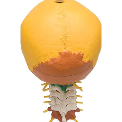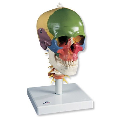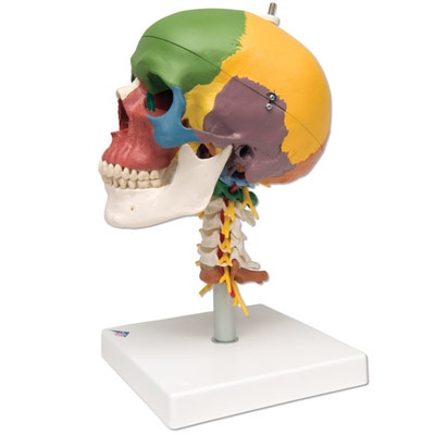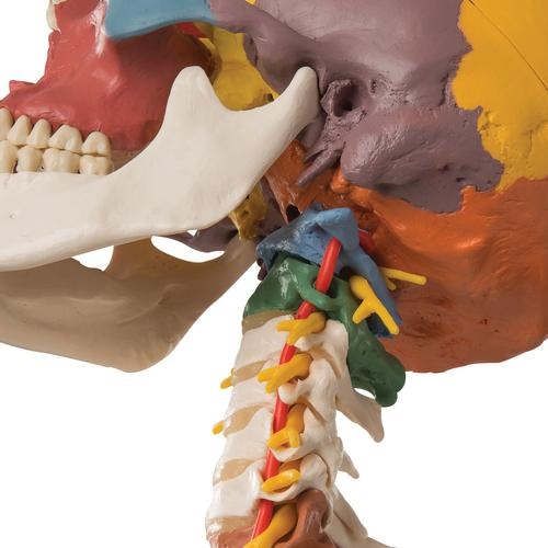 Didaktik-Schädel auf Halswirbelsäule, 4-teilig, Dieses Modell veranschaulicht die Formen und Beziehungen der verschiedenen Knochenplatten des Schädels zueinander mit Hilfe von 19 didaktischen Farben. Flexibel montiert auf der Halswirbelsäule (C1, C2 und C7 sind farbig), zeigt dieses Modell auch Rautenhirn, Rückenmark, Spinalnerven der Halswirbelsäule, Vertebralarterien, Basilararterie und hintere Hirnarterien. – Hochwertige Originalabformung – Handgefertigt aus hartem, unzerbrechlichem Kunststoff – Sehr akkurate Darstellung der Fissuren, Foramina, Processus, Nähte und anderen Details – Zerlegbar in Schädeldach, Schädelbasis und Unterkiefer – Auf Stativ. Größe: 17.5 x 17.5 x 30 cm