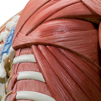 Er zeigt sowohl die oberflächliche als auch die tiefe Muskulatur und die beiden Hauptmuskeln M. deltoideus