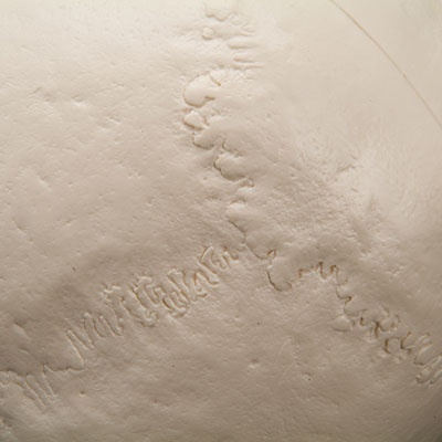 Klassik-Schädel auf Halswirbelsäule, 4-teilig, Bei diesem Modell wurde der Schädel abnehmbar auf die flexible Halswirbelsäule montiert. Dargestellt sind Rautenhirn, Rückenmark, Zervikalnerven, Vertebralarterien, Basilararterie und hintere Zerebralarterien. – Hochwertige Originalabformung – Handgefertigt aus hartem, unzerbrechlichem Kunststoff – Sehr akkurate Darstellung der Fissuren, Foramina, Processus, Nähte und anderen Details – Zerlegbar in Schädeldach, Schädelbasis und Unterkiefer – Auf Stativ. Größe: 20 x 13.5 x 15.5 cm
