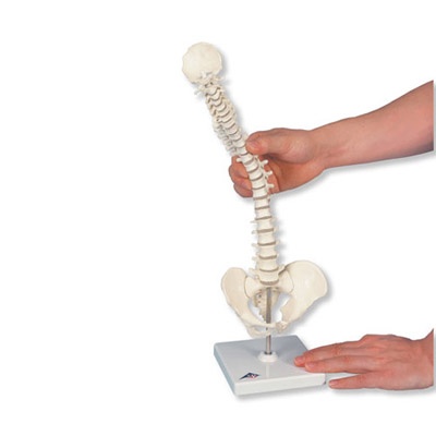 Zur Demonstration von natürlichen Bewegungsabläufen und pathologischen Veränderungen ist dieses Platz sparende Modell mit Hinterhauptschuppe und Becken elastisch montiert. Auf abnehmbarem Sockel.