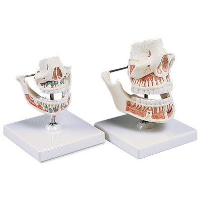 Zum eindrucksvollen Studium der Anlagen des bleibenden Gebisses sind Ober- und Unterkiefer eröffnet.