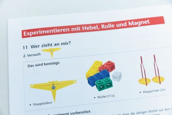 Kinder können anhand von Bildern die Versuche selbstständig durchführen und so z. B. entdecken, dass man mit einem Hebel schwere Gegenstände leichter bewegen kann.