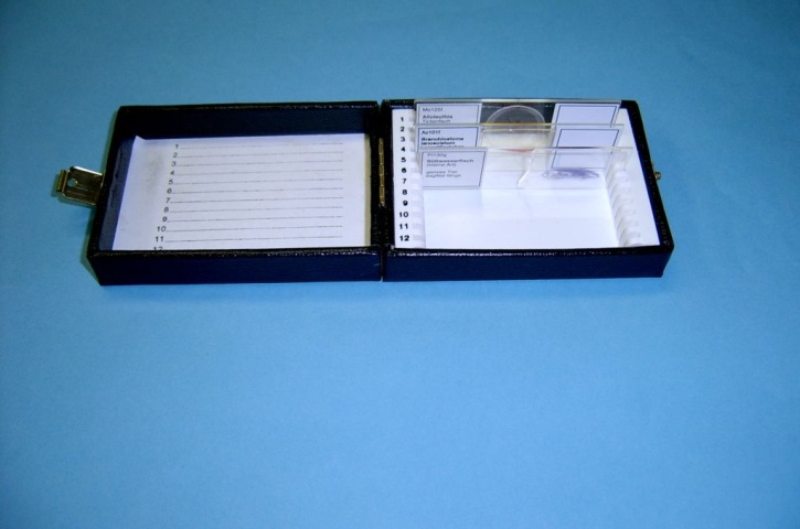 Präparatekasten (Standard) für 12 Präparate. Standardausführung: Stabile, mit schwarzem Lederimitationspapier überzogene Aufbewahrungskästen, innen mit nummerierten Zahnleisten zum Einstecken der Präparate.