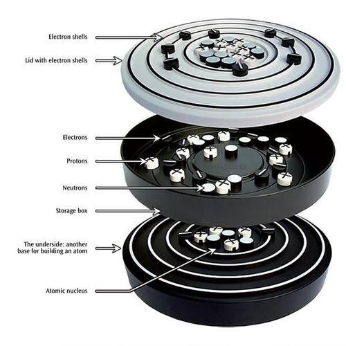 Lieferumfang: Schüler-Übungsmodell (mit 2 Atomen, 30 Protonen, 30 Neutronen und 30 Elektronen).