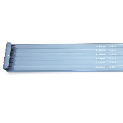 Gerät zur Untersuchung der Abhängigkeit des elektrischen Widerstands von Leiterlänge, -querschnitt und -material. Sechs Drähte sind nebeneinander auf eine Metallgrundplatte gespannt und an beiden Enden mit 4-mm-Buchsen verbunden.