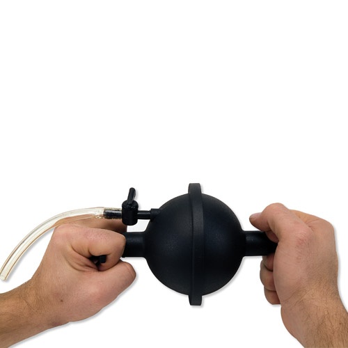 Zwei Kunststoff-Halbkugeln mit Handgriffen und eingelegtem Gummidichtungsring lassen sich vakuumdicht zusammensetzen.
