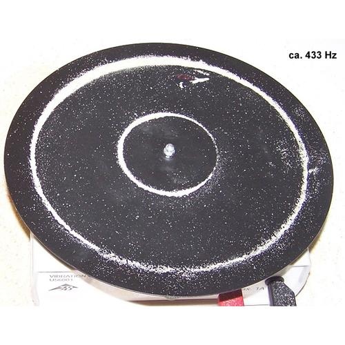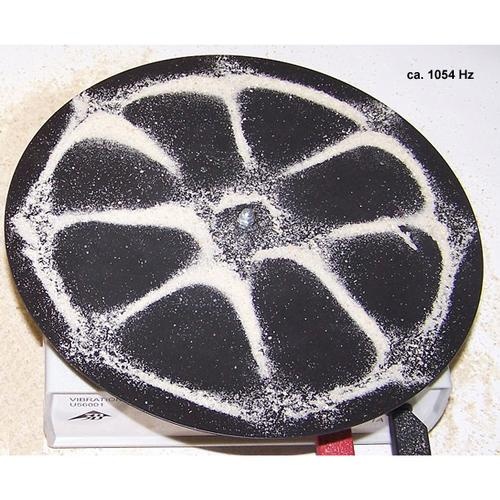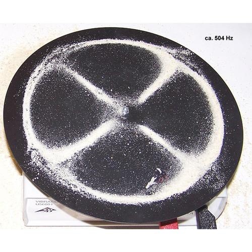 die Chladni-Platte, rund, dient zur eindrucksvollen Demonstration von Klangfiguren