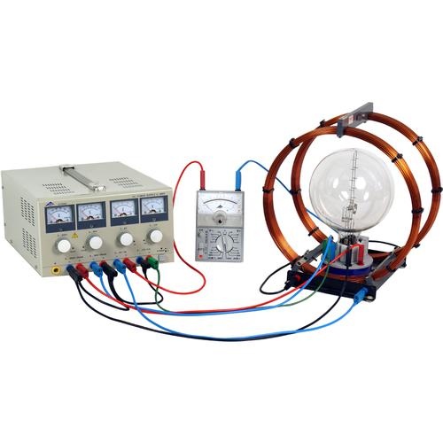 Unter Verwendung des Helmholtzspulenpaars (Art.-Nr.: 1000906) lässt sich mit dieser Fadenstrahlröhre die Ablenkung von Elektronenstrahlen im