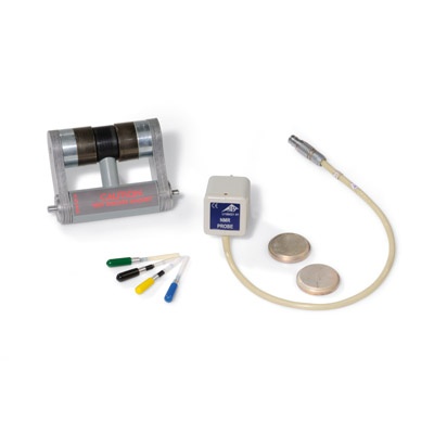 Das Set besteht aus der werkseitig eingestellten Basiseinheit mit den beiden Magnetspulen, der NMR-Sonde, der Glyzerinprobe, der Polystyrolprobe,