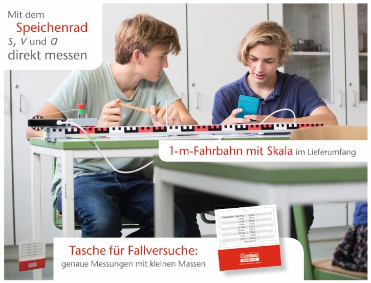Über das Speichenrad lassen sich Weg, Geschwindigkeit und Beschleunigung (s, v, a) direkt erfassen. Eine spezielle Tasche für Fallversuche erlaubt exakte Messungen auch mit kleinen Massen. Die im Lieferumfang enthaltene 1-m-Fahrbahn mit Skala unterstützt eine klare Visualisierung der Bewegungsabläufe.