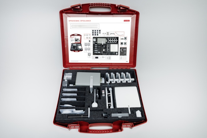 Einzelteile und Materialien: Blenden, Filter, Diapositive, Optikleuchte, Küvette, Linsen, Blenden- und Diahalter, Mattglasscheibe, Schattenkugel, Schirm- und Spiegelhalter, Prismenhalter, Reiter, Planspiegel, Wölbspiegel, Planparallele Platte, Halbzylinder, Prisma