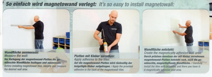magnetowand®, -- magnethafte Flächen günstig selbst herstellen -- Set für 1 qm (4 Platten), genau dort wo Sie sie brauchen. Damit gewinnen Sie preiswert zusätzliche magnethaftende Flächen für Poster, Aushänge Bilder und vieles mehr. -- Um mit den weißen Metallplatten magnethaftende Wandflächen zu erzeugen wird magnetowand® auf der Wand verklebt. -- Mit Hilfe von Magneten können dann mühelos Notizen, Pläne, Layouts, Kartons, etc. ordentlich an sonst ungenutzten Wänden befestigt werden -- magnetowand® sind weiße, korrosionsgeschützte, spannungsfreie Metallplatten (50x50 cm groß, ca. 0,5 mm dick). magnetowand® wird als Set geliefert und enthält den notwendigen Kleber, 1 Zahnspachtel und die Spachtelmasse.