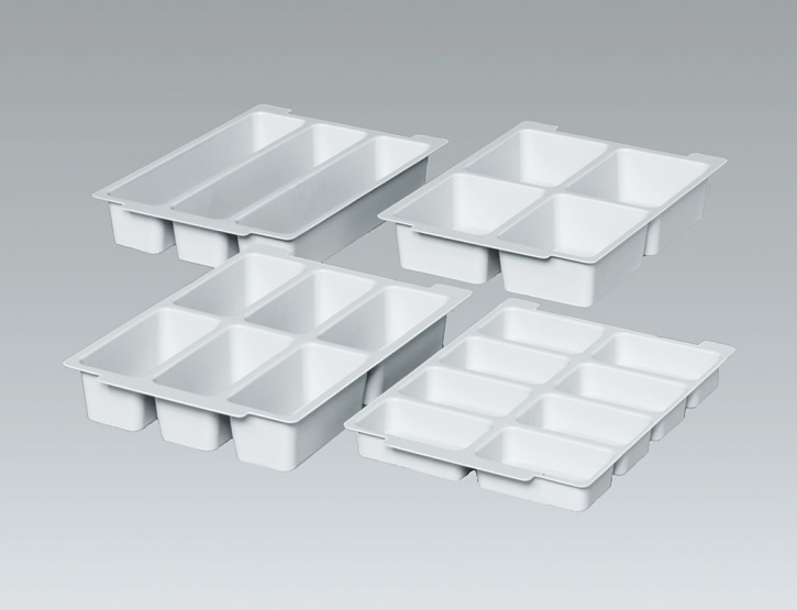 Vakuum-Tiefzieheinsätze aus hellgrauem Kunststoff mit verschiedenen Facheinteilungen,