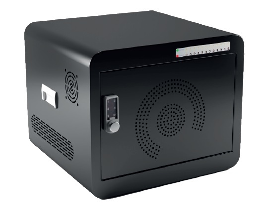 Die mobile Transport- und Ladebox für 12 Tablet's verfügt über seitliche Griffe