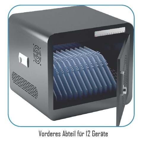 Mobile und stabile Stahl- Ladebox für das Aufbewahren, Transportieren und Laden von bis zu 12 Tablets