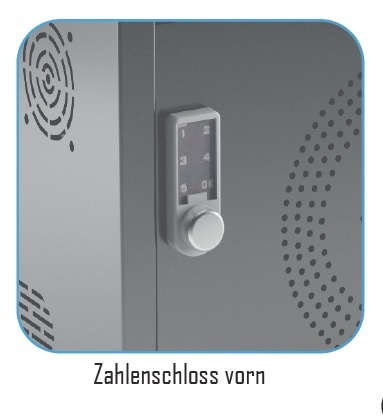 Zur Sicherung der Geräte ist die Tabletbox mit einer Fronttür mit numerischem Zahlenschloss