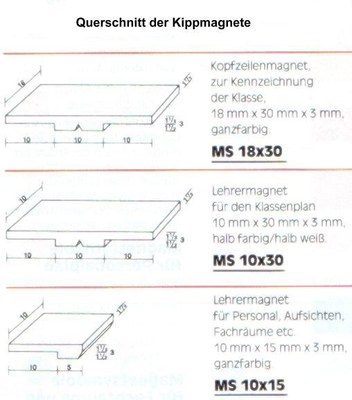 für die Kopfzeile: 1x Kippmagnet 18x30 mm, weiß, zur Kennzeichnung der Klasse und 1x Kippmagnet 10x30 mm, weiß, für den Namen des Klassenlehrers