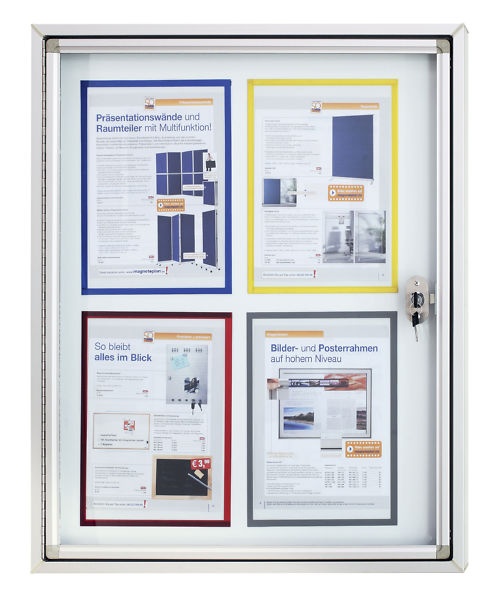 Schaukasten CC für den Außenbereich, mit Acryl-Sicherheitsglas, für 4 DIN A4 Blätter, abschließbar -- Rückwand in weiß, magnetisch und mit Whiteboardmarkern beschreibbar -- Abmessungen: BxH Außen 65x79 cm, Sichtfläche 54x68 cm, -- Innentiefe = 2 cm, es können mehrere Schaukästen nebeneinander montiert werden -- wasserdichte Aluminiumeinfassung -- Rückseite aus verzinktem Stahl -- Lieferung inklusive 2 Schlüssel