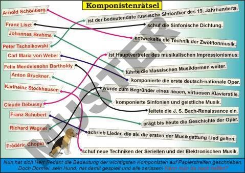 Transparente: Rätselspiele, 1. Von der Romantik bis zur Gegenwart. In einem zusammenfassenden Artikel über die Komponisten haben sich Fehler eingeschlichen. Eine knifflige Korrekturaufgabe für die Lerngruppe! 2. Komponistenrätsel: Rätsel und Lösung, 4 Folien, 2 Kopiervorlagen, Lehrerbegleittext
